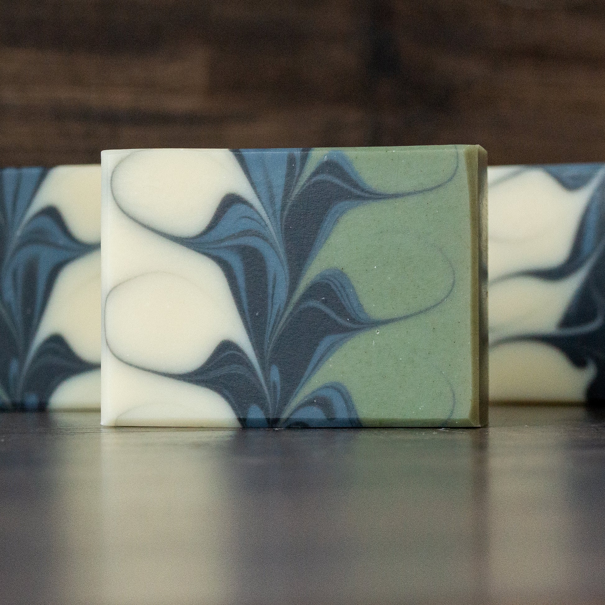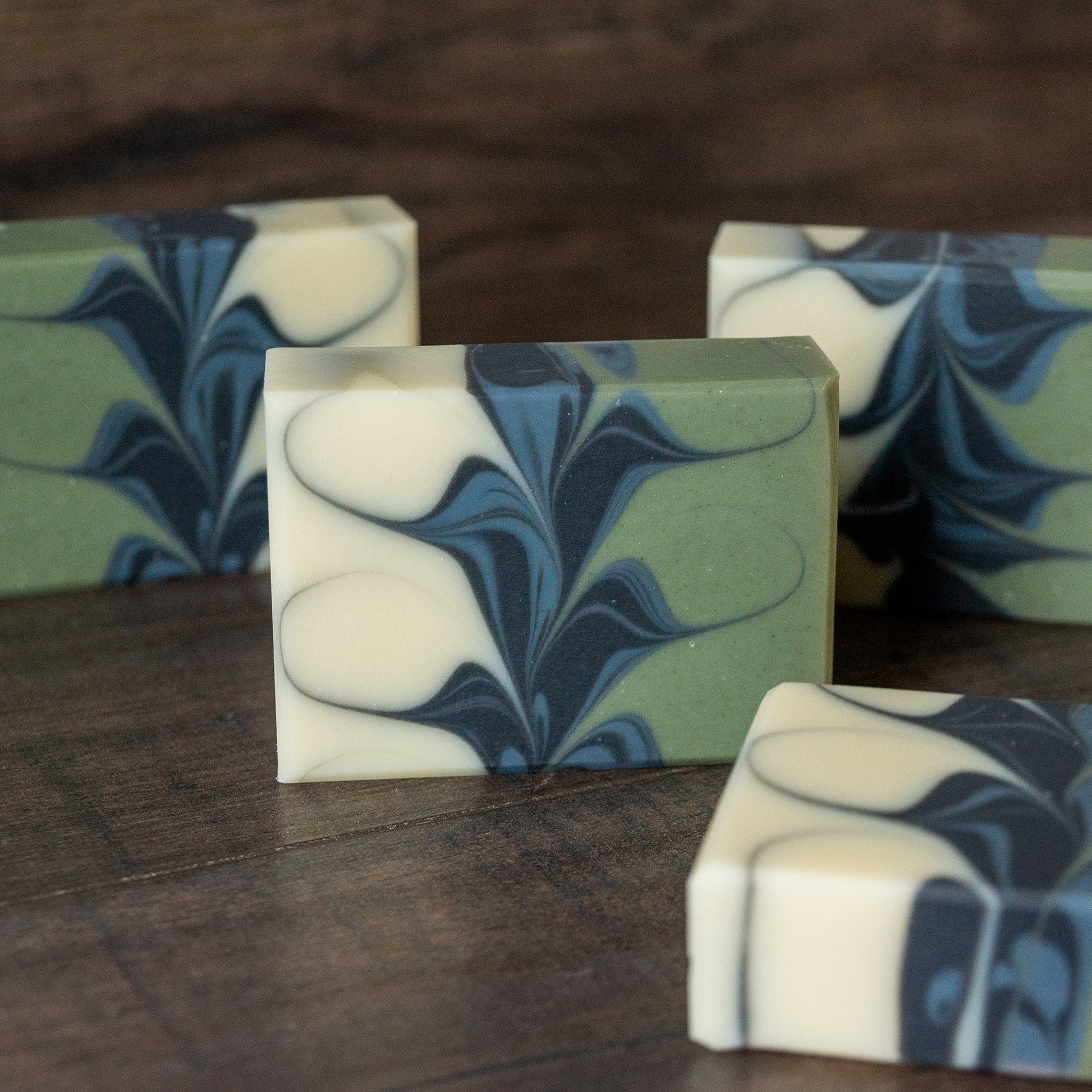Minty-fresh, swirly soap naturally colored with activated charcoal, spinach, and indigo powder, plus French green and white kaolin clays.